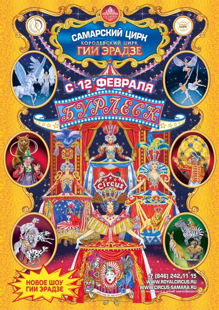 На манеже Самарского цирка Заслуженный артист России Гия Эрадзе представит новое грандиозное шоу «БУРЛЕСК» — настоящую жемчужину Российской государственной цирковой компании, созданную на основе номеров, покоривших Княжеский дом Монако!